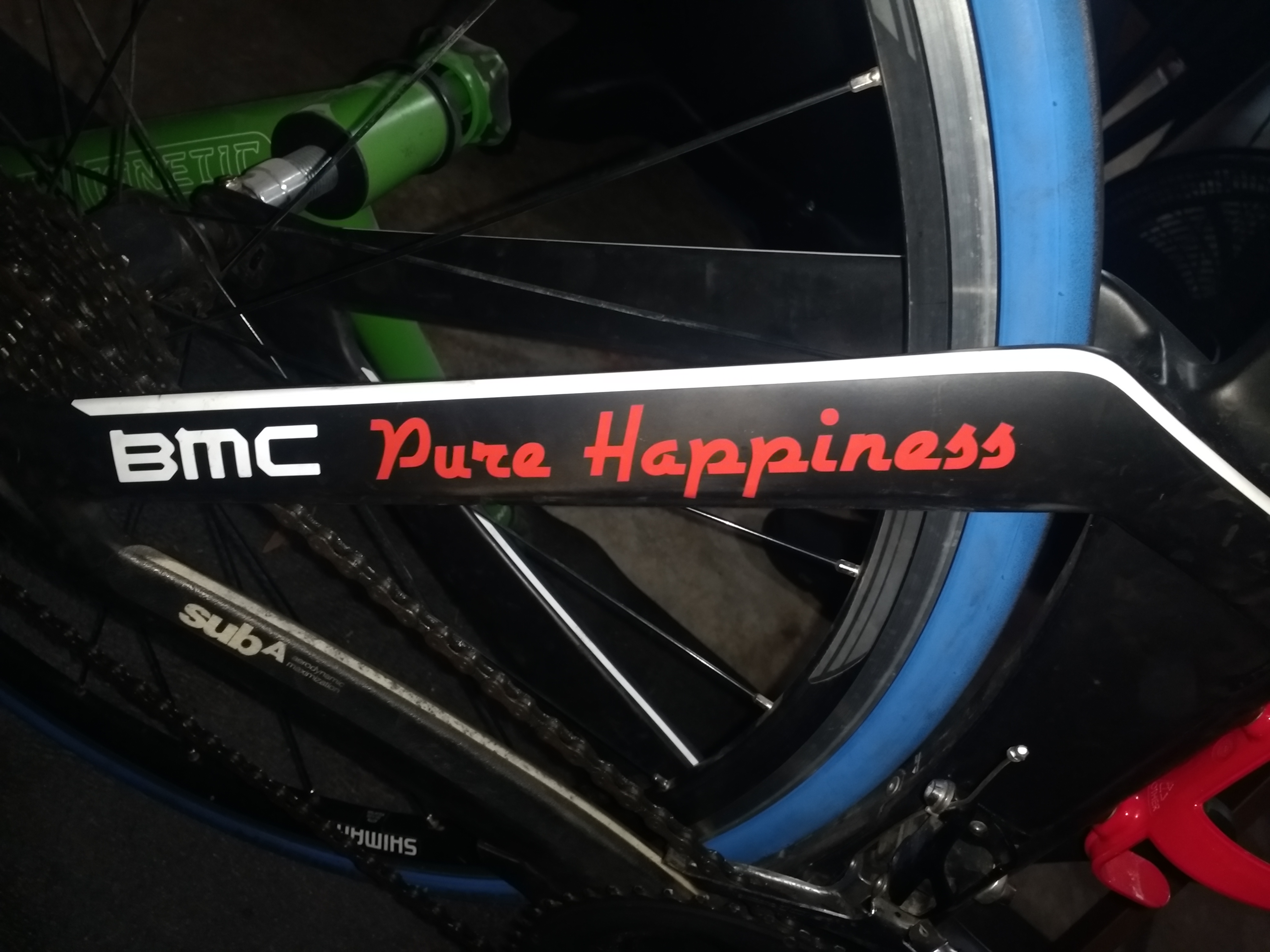 I am still enjoying those bikes (a road bike and my commuter bike). But a couple of years ago I added a tri bike to the mix – just for fun, unrelated to a death in the family. This is the story of her name, Pure Happiness.