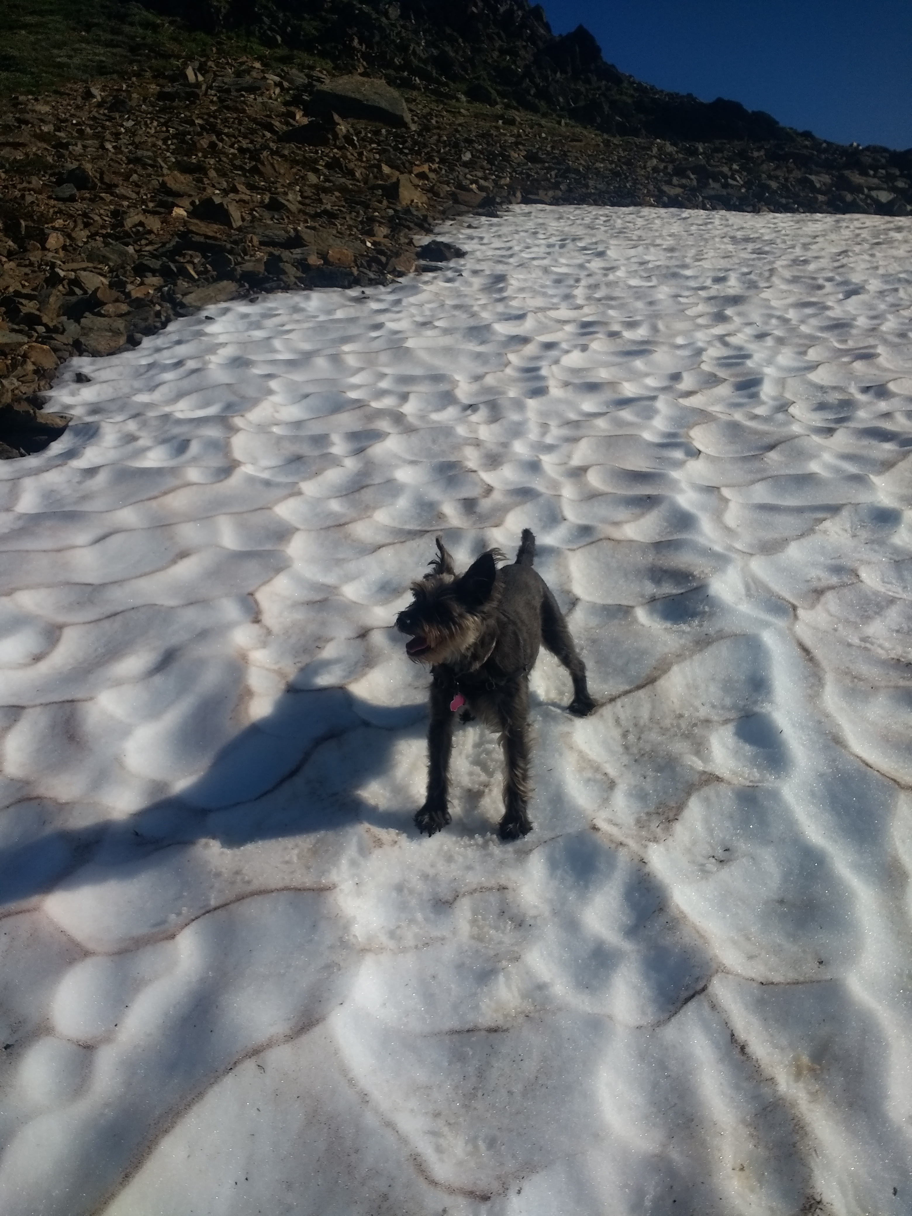 I kept thinking the terrain would get easier, but it really didn’t until the very end. It seemed to drag on and on with slow mileage. It was a gorgeous day (hot, but lovely) with streams and pools and snow to play in. Unfortunately, I’m quite horrible at stopping to just enjoy myself. I also realized quickly that the trip was going to take longer than I had anticipated and we had to get back to let our older dog out.