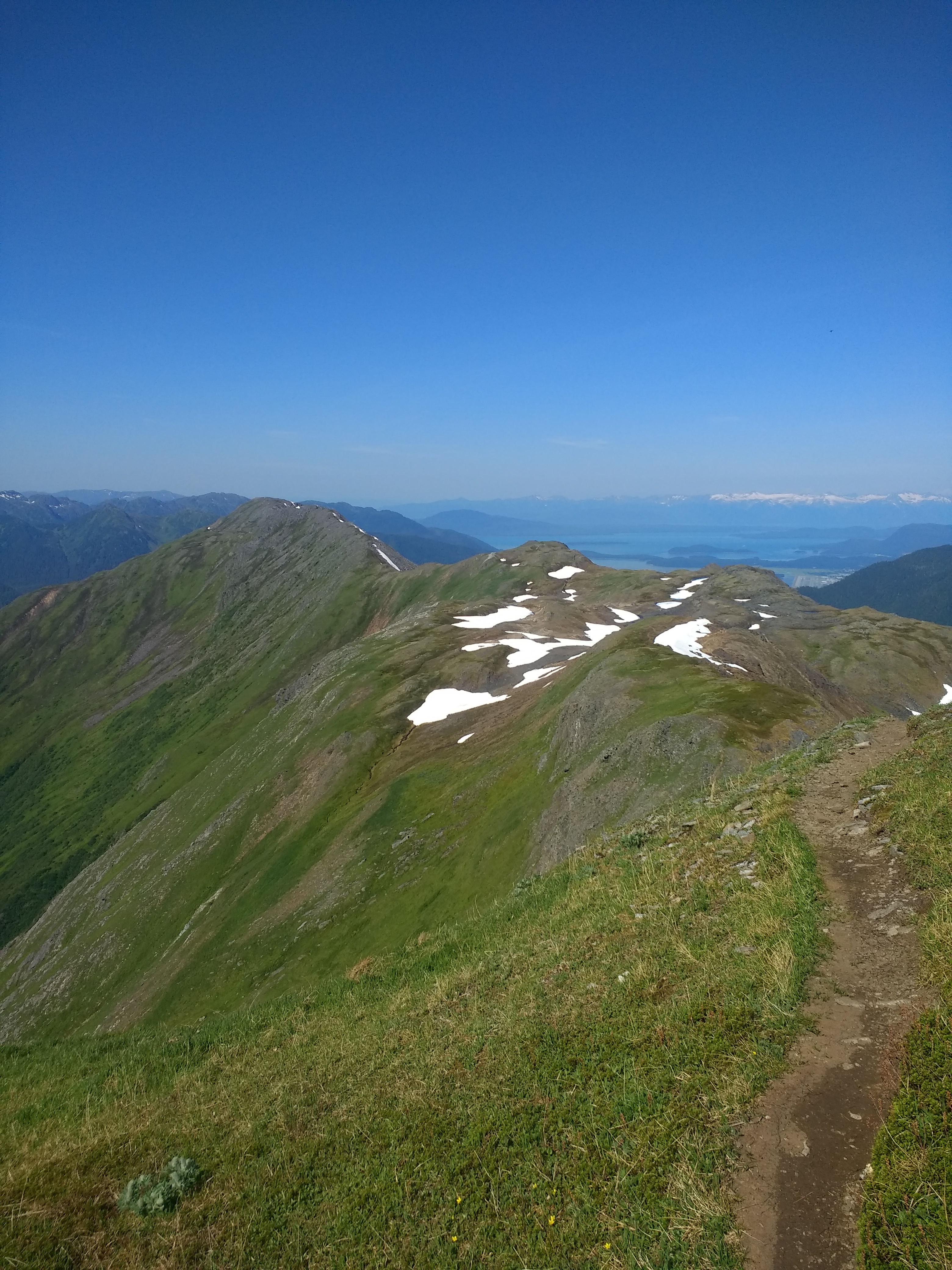 And so it did. The trail went up and down. I naively pictured a nice easy walk along the ridge after topping Mt. Juneau. Sometimes I forget that I live in Alaska, where there may be no nice easy, grassy, calm, ridges. It continued to be very slow going, and I managed to lose the trail a couple of times. Once due to snow, and once because the terrain just didn’t seem to hold a trail. Both times were pretty easy to find, and all in all the trail is really quite fine to navigate.